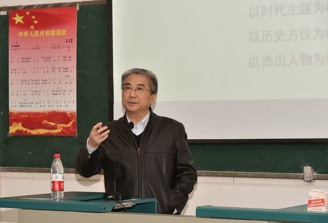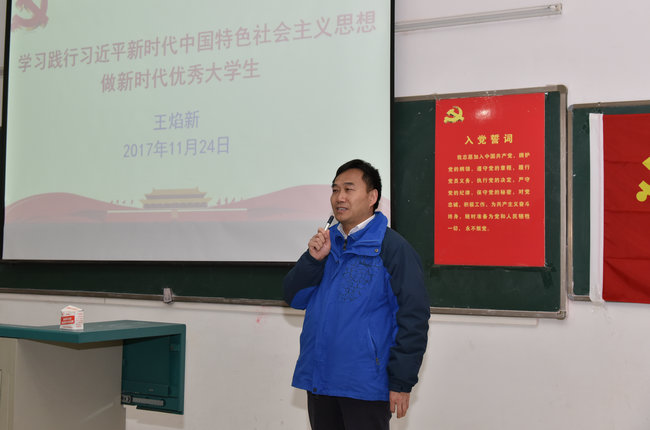 (beat365中文官网张学海 孟国强)2017年11月24日晚在化学楼一层阶梯教室,王焰新校长以“学习践行习近平新时代中国特色社会主义思想,做新时代优秀大学生”为题讲党课。beat365中文官网党委书记李素矿,beat365中文官网学工组全体老师,学院学生党员、入党积极分子、学生干部等参加了党课学习。