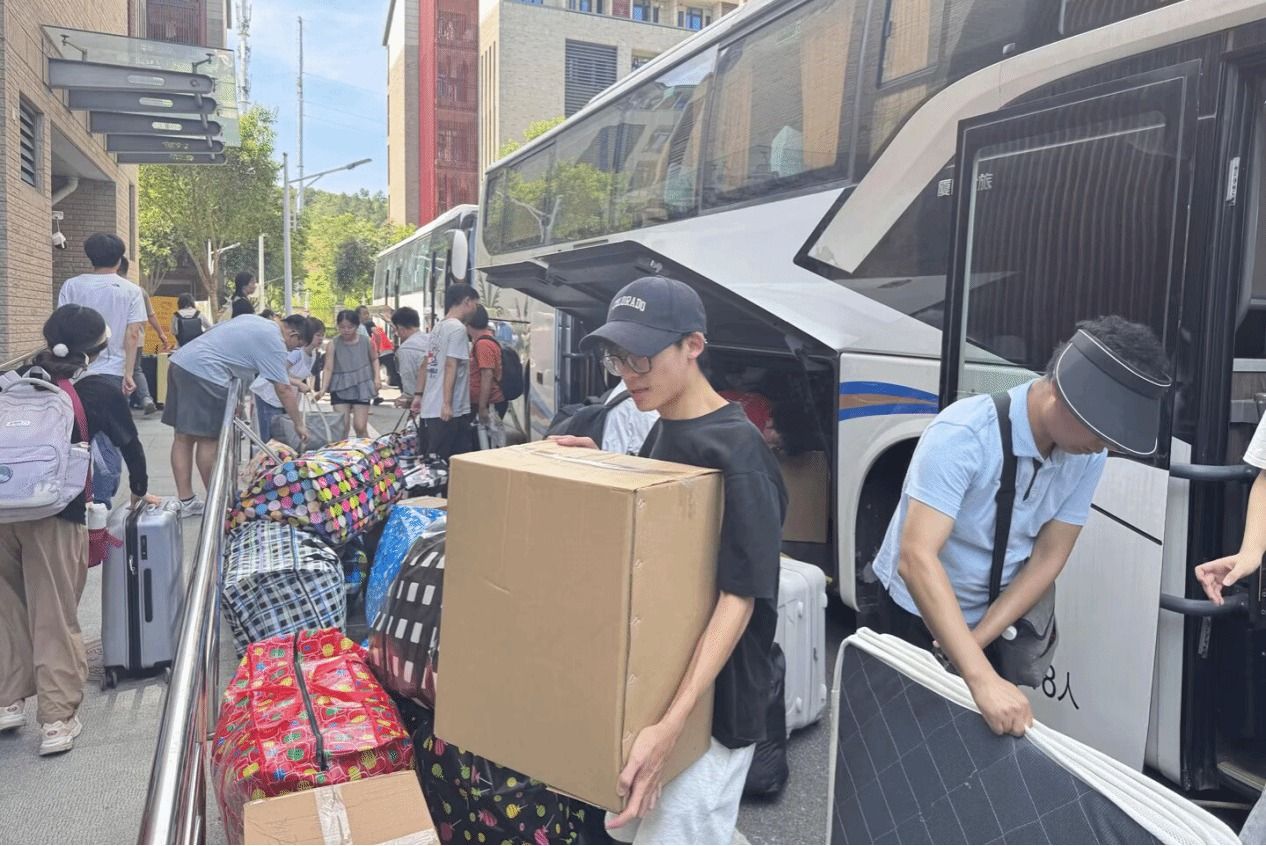 清晨,搬迁工作在南望山校区有序启动。党委副书记王海锋、24级班主任潘欢迎老师和24级辅导员细致组织同学们装车。与此同时,未来城校区接应组也已准备就绪。党委书记姜明敏带领全体学工组辅导员、学生志愿者准备接车。