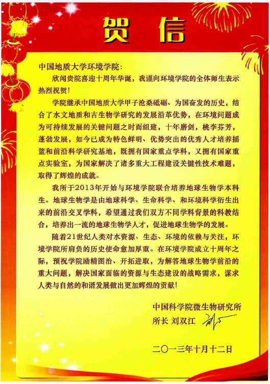中国地质大学(北京)水资源与beat365中文官网发来院庆贺信