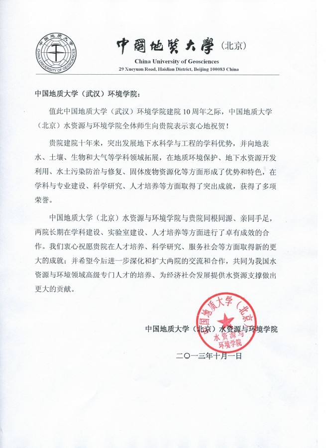 中国地质大学(北京)水资源与beat365中文官网发来院庆贺信