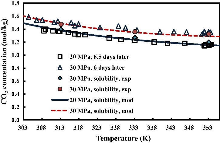Fig. 1. Comparison of the steady state CO2 concentration profiles at 20 and 30 MPa, to the solubility measured by Guo et al. [14] (solubility, exp), and the solubility calculated from the model developed by Guo et al. [15] (solubility, mod).