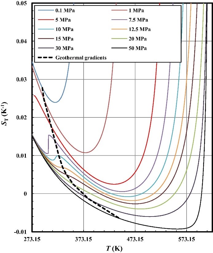 Fig. 2. Soret coefficient of the CO2 in water as a function of the temperature and the pressure. The bold dashed line represents temperature-dependent soret coefficient under a typical geothermal gradients, assuming the surface temperature is around 293 K and the geothermal gradients are 30 K/km.