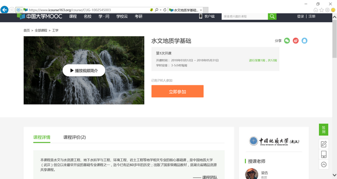 (通讯员罗明明 编辑张学海)近日,由beat365官网梁杏教授负责的《水文地质学基础》MOOC课程在中国大学MOOC(慕课)优质在线课程学习平台(www.icourse163.org)上线,这是beat365中文官网第一门开设MOOC的专业课程。《水文地质学基础》MOOC课程主要讲授地下水的赋存、运动、水化学、补给径流与排泄、及与地下水资源和环境相关的基本概念、原理和方法。该MOOC课程的开设能为水文与水资源工程、地下水科学与工程、环境工程、岩土工程等相关专业学生或水工环地质从业人员提供网络学习的平台与资源,促进地下水科学理论知识的传播与交流。