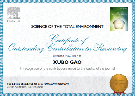 高旭波副教授同时还担任了《Journal of Geochemical Exploration》、《Environmental Science and Pollution Research》、《International Journal of Environmental Research and Public Health》、《Journal of Hazardous, Toxic, and Radioactive Waste》、《Applied Geochemistry》、《Environmental Monitoring and Assessment》、《Frontiers of Earth Science》、《地球科学(英文版)》等10余国内外SCI期刊的长期审稿人,近年来审稿80余篇。