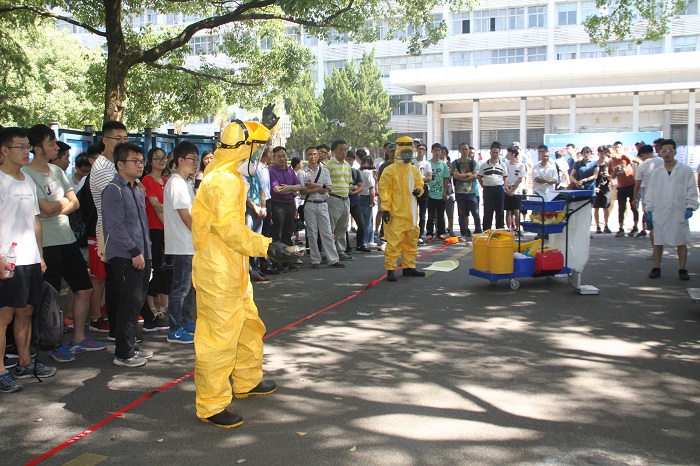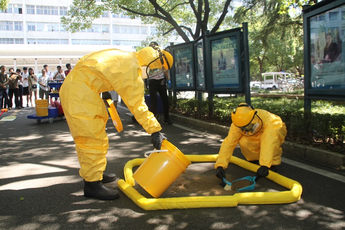 活动共分三个阶段。一是危化品泄漏应急演练。beat365中文官网8名学生代表穿上密不透风的防护服、防毒面罩和护目镜全程参加演练。演练以实验室有机废液转运泄露事故为案例,模拟了实验员意外碰倒有机废液桶后,上报事故、现场封锁及事故危害评估、应急救援人员个人防护、消除危险源与现场恢复、事故发生后的报告、调查与评估等应急救援环节。