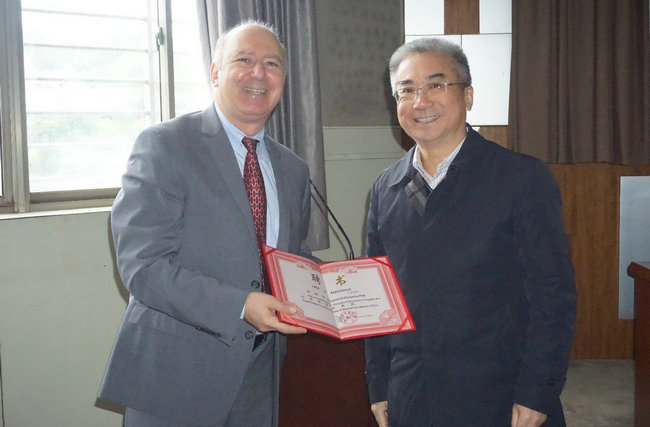 王焰新校长为Dion教授颁发客座教授聘书。