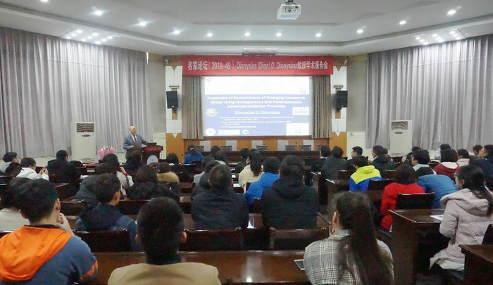 Dion教授介绍了辛辛那提大学概况,从饮用水污染物和存在于地表水、地下水及工业废水等的新兴污染物的处理处置入手,生动地讲述了基于紫外光催化和可见光催化高级氧化技术的研究及应用进展。介绍了紫外可见光体系固体催化剂的活化机理以及在实际水处理过程中所起的作用。Dion教授分享了目前的研究热点,如紫外光-氯以及紫外光-硝酸盐体系的反应机理和应用效能,还指出了未来的研究方向。Dion教授的报告引起了beat365官网师生的强烈反响。