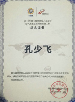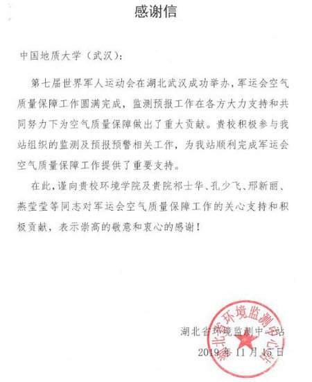 这封感谢信是由湖北省环境监测中心站发出的,随同寄来的还有颁发给大气环境团队5位教师、25位研究生个人的“2019年第七届世界军人运动会空气质量监测预报预警工作”纪念证书。纪念证书中提到“第七届世界军人运动会于2019年10月18日至27日在湖北武汉成功举办,感谢您对军运会空气质量保障工作的关心支持和积极贡献。”
