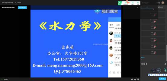 水力学和流体力学是beat365中文官网水文与水资源工程、地下水科学与工程、环境工程专业的一门重要的专业基础课,本学期共有7个班,200余名学生参加学习。在全国人民共同抗击新冠肺炎疫情的关键时刻,在举国上下抗击疫情的特殊时期,《流体力学(水力学)》课程团队积极响应教育部“停课不停学”的号召,迅速参与“地大一平三端”的学习培训,认真研究《流体力学(水力学)》课程教学特点、网络教学资源的状况,确定采用“以学为主、以导为辅”的线上、线下混合式教学方式,即首先由教师引导课程教学目标和知识要求——学生直接利用网上水力学精品教学资源自学——教师线上课堂串联与质疑各章节知识要点、网上直播——学生+教师在线讨论释疑——学生线下练习巩固——教师考核及反馈。