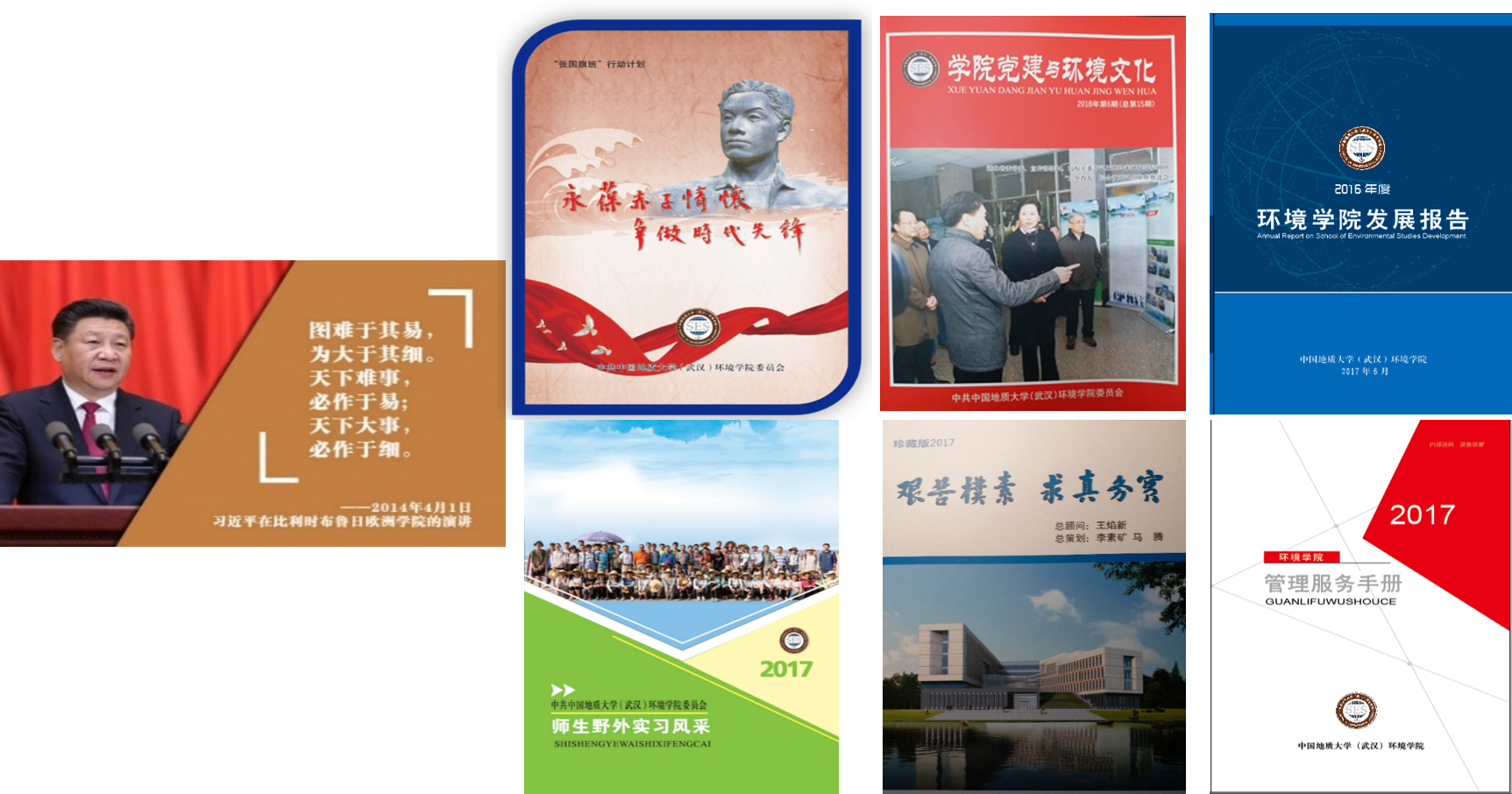 五年来,“张国旗班”行动计划始终在积极营造浓厚的文化氛围,打造特色思政文化品牌,滋养环境文化根系。学院倾力打造 “1+6”思政育人载体,如:《我最喜爱的习近平总书记的一句话》系列明信片,将新思想、新理念播撒在学生的心中;每年编印《师生野外实习风采展》,记录环境学子在山水林田湖草间躬行的身影;院刊《学院党建与环境文化》至今已编印34期,记录学院党建工作动态;《beat365中文官网年度发展报告》则集中梳理历年学院发展的高光时刻;《师生管理服务手册》做到精细化服务师生 ;创作的院歌《艰苦朴素 求真务实》人人传唱,唱出环境人的豪迈;《“张国旗班”行动计划画册》浓缩着环境学子的成长历程。