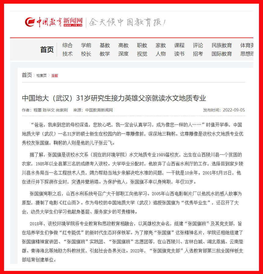 据张云飞介绍,张国旗殉职时,自己才10岁,“向张国旗学习”成为幼年的他耳边听到最多的一句话。2010年高考时,张云飞发挥失常,与父亲的母校失之交臂,被云南一所大学的地理信息系统专业录取。毕业后工作期间,看到“张国旗班”建设的系列新闻报道后,张云飞下定决心考研,继续攻读水文地质学专业研究生。2022年研究生入学考试中,他过关斩将,成功被中国地质大学(武汉)beat365中文官网录取。