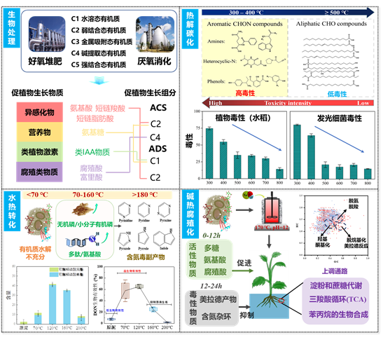 在此基础上,团队探究了污泥稳定化处理过程(生物处理,热处理)中有机质的转化规律,阐明了污泥稳定化产物中有机质的生物效应,发展了污泥水热转化制备植物活性有机质的新工艺。污泥生物稳定化产物中好氧堆肥污泥的弱结合态和碱提取态有机质和厌氧消化污泥的溶解态和弱提取态有机质是主要的促植物生长组分,其中异感化物(短链脂肪酸,氨基酸)、营养物质、类植物激素和腐殖质类物质是主要的促植物生长物质,可以通过上调“碳水化合物代谢”、“脂质代谢”、“氨基酸代谢”促进植物生长,同时导致“苯丙素生物合成”通路上调而提升植物抗逆性;污泥热解碳中,300-400oC热解后污泥碳中溶解性有机质主要为高生物毒性含氮芳香性化合物及酚类,而在500-800oC热解碳中溶解性有机质为低毒性的直链脂肪酸,提升热解温度是控制污泥碳毒性的重要方式;污泥水热转化中,温度升高导致有机质释放,并伴随部分蛋白质和多糖水解为多肽、氨基酸、小分子糖等植物活性有机质,随温度进一步美拉德反应加剧,生成类黑精化合物;污泥碱热腐殖化过程呈现出三阶段级联反应,依次为有机物水解、发生脱氨、脱羧和脱氧反应以及脱碳反应。碱热时间为12h时,污泥水解液的植物活性最高,水解液中的多糖、氨基酸和腐殖酸等活性物质通过上调“淀粉和蔗糖代谢”途径,促进水稻幼苗能量代谢和碳水化合物的储存,基于此发展了污泥水热转化回收植物活性有机质与毒副产物控制的新工艺。