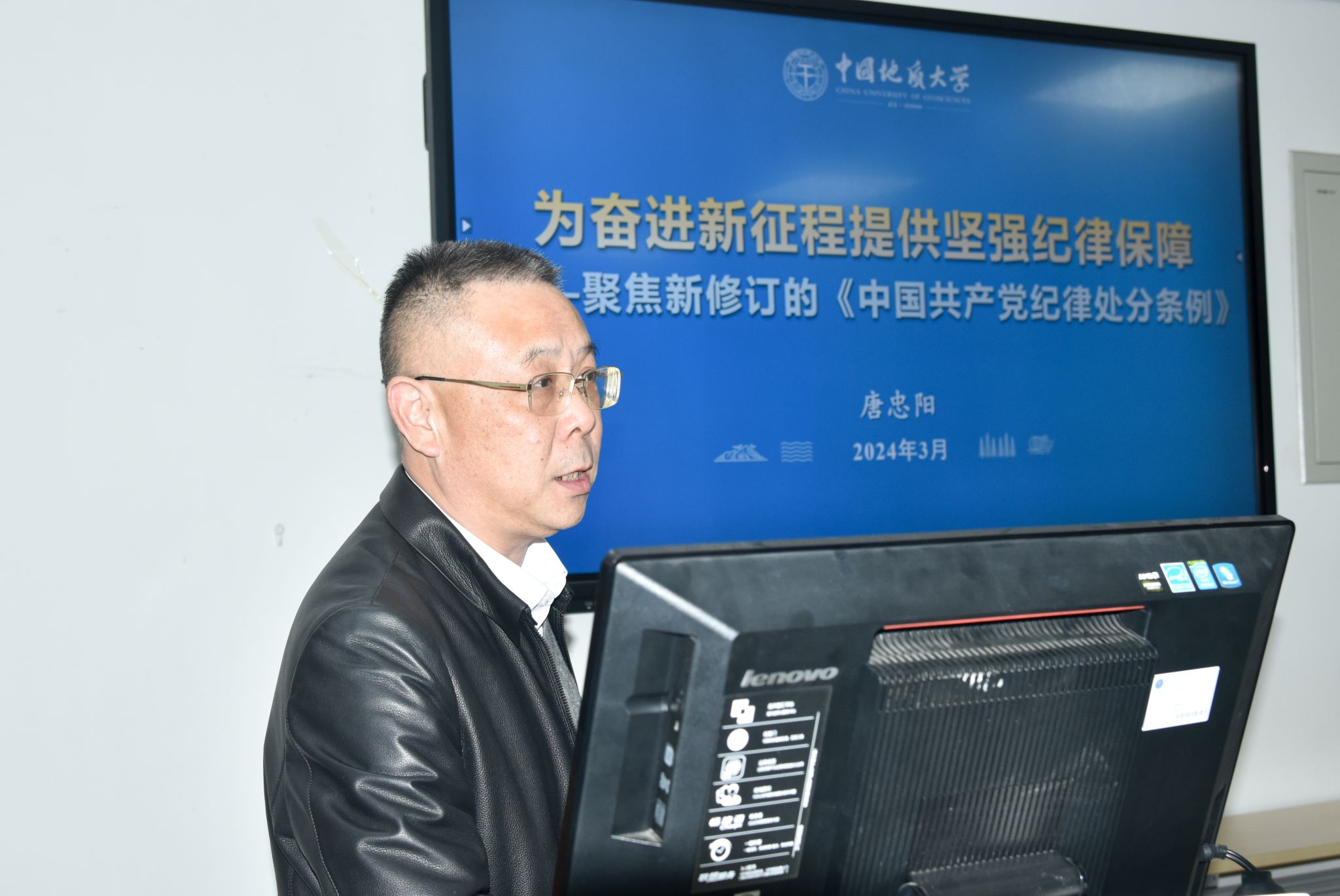 (通讯员/编辑何娟 摄影张学海)2024年3月26日上午在科教楼四347报告厅,校党委副书记、纪委书记唐忠阳以“为奋进新征程提供坚强纪律保障——聚焦新修订的《中国共产党纪律处分条例》”为题,为beat365中文官网师生讲专题党课。beat365中文官网领导班子成员,三级单位班子成员、院直全体党员,全体师生党支部书记、支部委员等参加学习。
