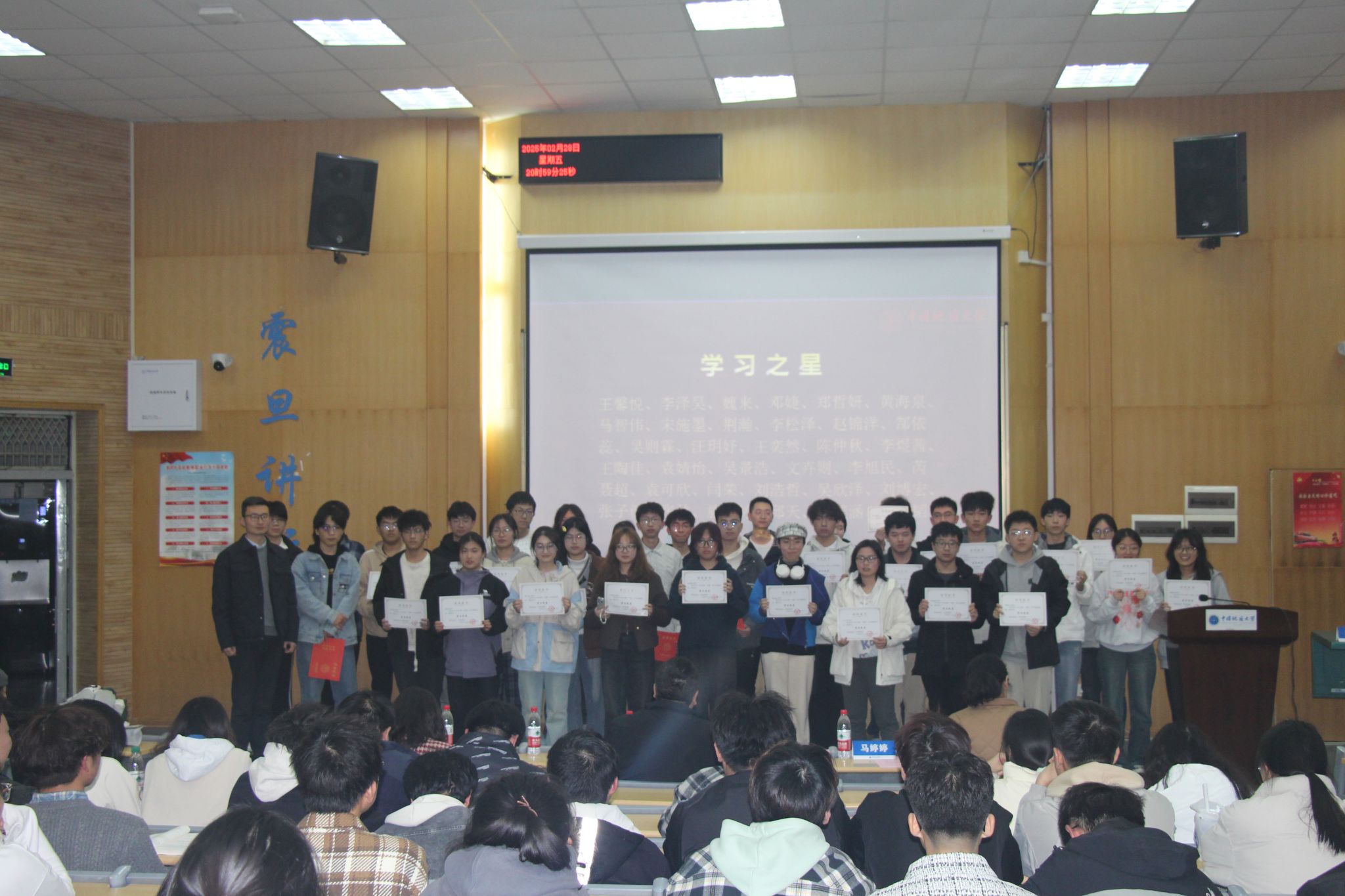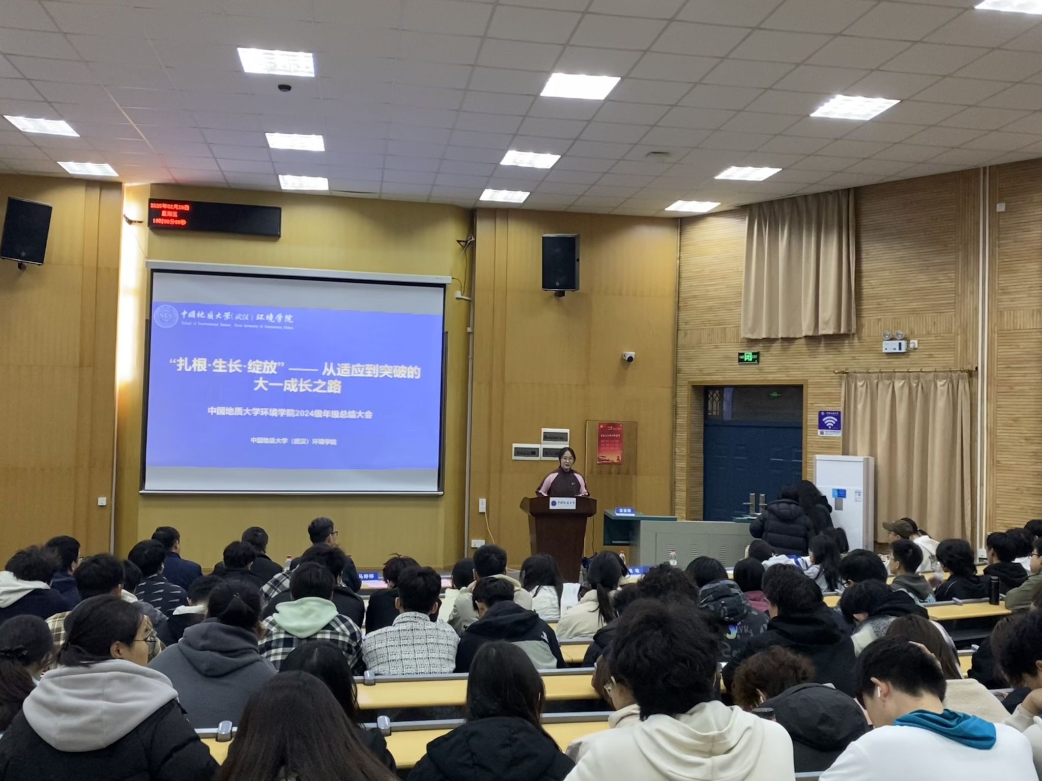 (通讯员宋霖、张朝 编辑王孟雪)2025年2月28日,中国地质大学(武汉)beat365中文官网2024级本科生年级总结表彰大会在教三楼109室举行。本次会议的主题是“扎根 生长 绽放”,从适应到突破的大一成长之路,旨在通过总结学期工作、分享学习经验、表彰优秀学生,为同学们的未来学习和生活指明方向。学院党委副书记王海锋、学校安全保卫部法律援助办主任魏景明、班主任代表潘欢迎、鲁小璐、辅导员宋霖及高年级学生代表出席会议,2024级全体本科生参加会议。2024级本科生辅导员宋霖主持会议。