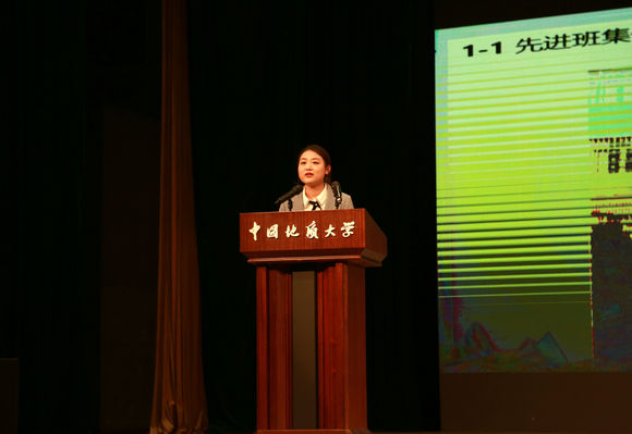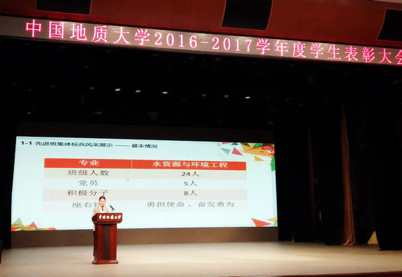 040151班班长姜璐在2016-2017学年度校学生表彰大会上分享班级建设经验