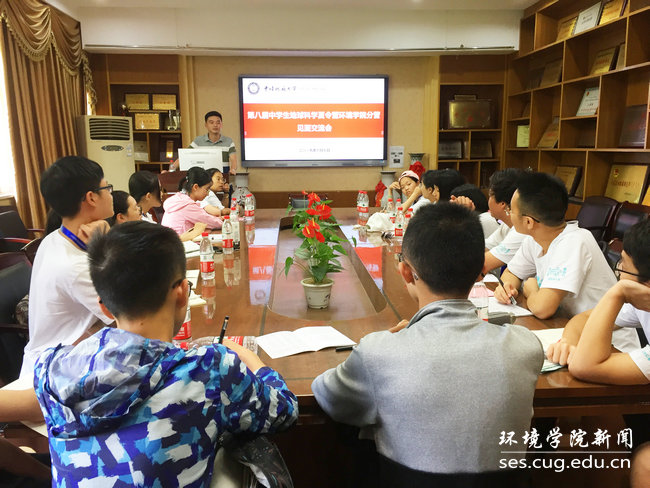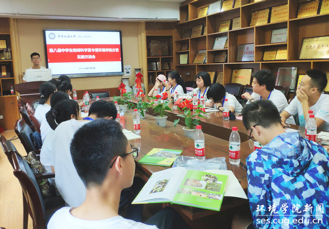 7日下午,第八届中学生地球科学夏令营环境分营见面交流会在文华楼201会议室举行。学院为每位营员准备了2019届毕业生文化衫、2018年师生野外实习风采展。学院团委书记王碧、兼职辅导员汪静、学生骨干代表王俊霖、陈柳源与营员们进行了互动交流。