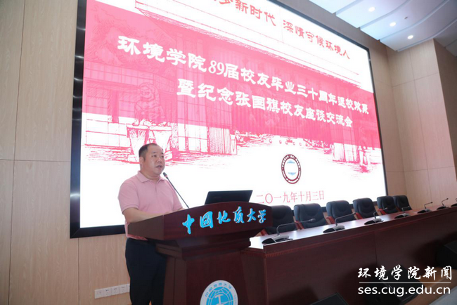 时任89届水文地质与工程地质系辅导员、现任校党委常委、组织部部长储祖旺作总结讲话。他表示,非常高兴与校友们相聚未来城校区,共同见证学校近年来取得的巨大发展。学校的改革发展与校友们息息相关,离不开校友们的关心与支持。他谈到,张国旗是国家改革开放四十一年以来涌现出来的优秀典型之一,他在平凡的岗位上干出不平凡的事,他具备的专业报国、人民情怀、淡泊名利、敢于牺牲自我的精神品质是地大人精神的体现,值得我们去学习、弘扬。他强调,以张国旗为代表的89届校友们在各自岗位上将报效祖国与个人发展有机结合,为国家发展作出了贡献。他希望,校友们继续保持奋斗状态,发扬校训精神,继续书写人生辉煌的篇章。