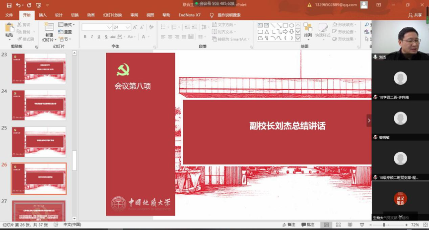 副校长刘杰总结讲话。首先他向发言分享的三位防疫志愿者以及全体防控一线志愿者致敬,他们充分展现了beat365中文官网学生党员、地大青年党员应有的担当精神。随后,他就如何加强党支部建设提出要求。他希望各支部认真学习《中共教育部党组关于高校党组织“对标争先”建设计划的实施意见》,在教育党员、管理党员、监督党员、组织师生、宣传师生、凝聚师生、服务师生方面下功夫,积极建设样板党支部。对照具体要求,查找短板弱项,分析问题原因,强化整改落实,解决突出问题。他向党员同志们提问并希望大家做出进一步思考:面对此次疫情,青年党员要明确如何看待人民、党员应该有怎样的人民观;如何看待中国共产党的领导和党中央的决策部署;如何看待中国特色社会主义制度优势;如何看待一个党员的责任和使命。最后,他提醒党员同志要树牢“四个意识”,坚定“四个自信”,做到“两个维护”,只有坚持党的领导,才能实现伟大的中国梦。