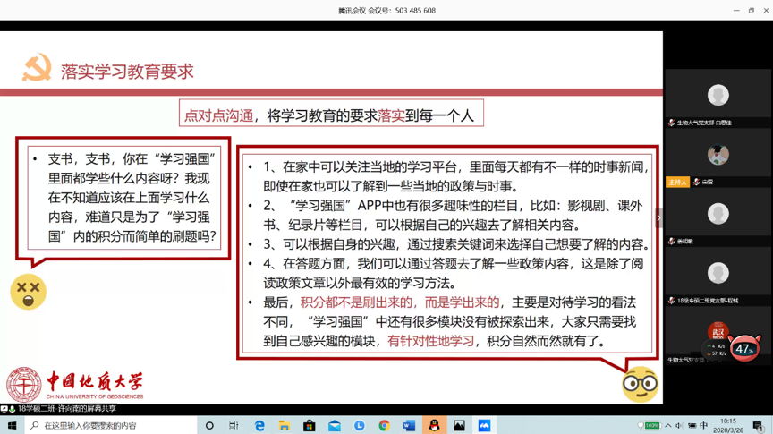 近日,学校党委学生工作部下发《关于做好疫情期间学生党建工作的通知》,学院积极落实,充分利用“学习强国”平台,加强支部理论学习,深入推进“两学一做”学习教育常态化、制度化,开展争创学习型党支部交流活动。学生党支部代表和学生党员代表在联合主题党日上分享了“学习强国”的学习经验。