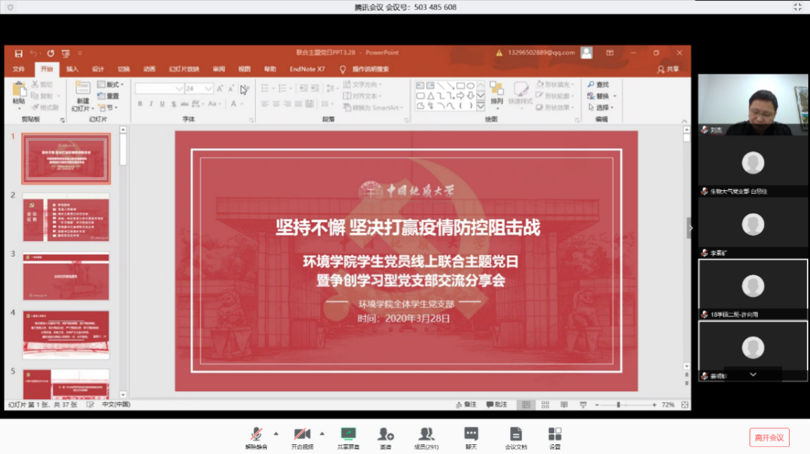 (通讯员宋霖、韩鹏、白思佳  编辑耿婧)3月28日上午,beat365中文官网全体学生党员通过腾讯会议室以“坚持不懈 坚决打赢疫情防控阻击战”为主题召开线上联合主题党日暨争创学习型党支部交流分享会。副校长刘杰,学院党委书记李素矿、党委副书记姜明敏、学工组全体老师应邀参加会议,党建辅导员宋霖主持会议。