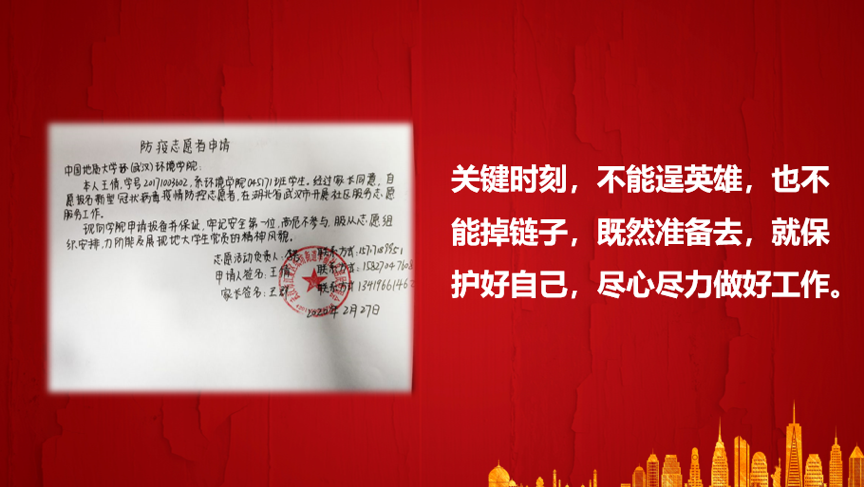 (通讯员王倩、宋霖  编辑耿婧)疫情爆发,武汉封城,地下水专业大学生党支部的党员同志王倩,响应号召留在了武汉,留汉的日子里,王倩同志和姐姐一起加入了武汉疫情防控青年志愿者团队,王倩同志的父母也在家乡负责着疫情防控的相应工作。一家四口,两地分隔,却在共同为着早日战胜疫情在努力。