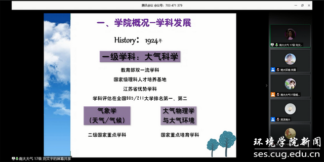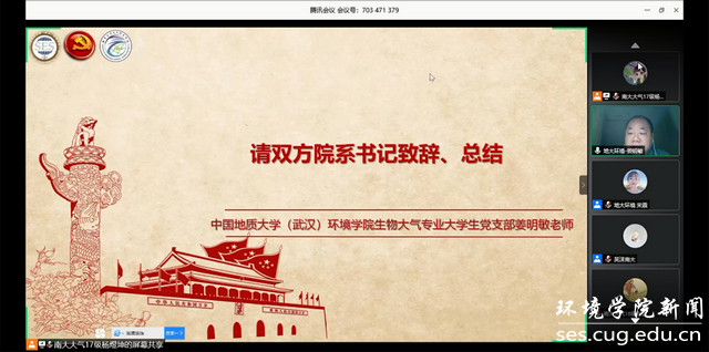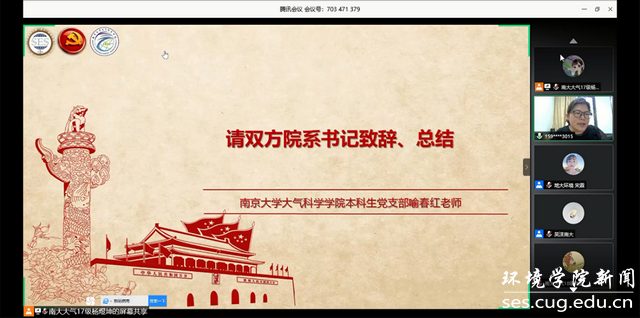 (通讯员宋霖、李晴  编辑耿婧)2020年5月23日周六上午十点,中国地质大学(武汉)beat365中文官网生物大气专业大学生党支部与南京大学大气科学学院本科生党支部通过腾讯会议举行了一场别开生面的云共建活动。南京大学大气科学学院党委副书记喻春红、辅导员吴沫,中国地质大学(武汉)beat365中文官网党委副书记姜明敏、党建辅导员宋霖,以及两个党支部的全体学生党员参与此次云共建活动。