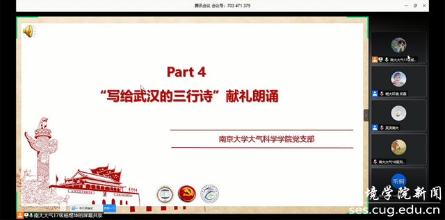 活动第四项,南京大学大气科学学院本科生党支部的党员代表为武汉学子献礼朗诵“写给武汉的三行诗”。南京和武汉,共饮长江水,虽远却心相连。南京大学大气学院党支部的同学们将充满希望与鼓励的三行诗,献给武汉,献给为武汉无私奉献的工作者和志愿者,祝愿武汉早日康复。