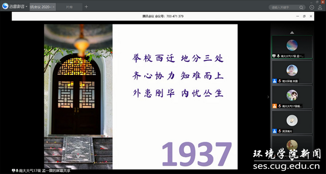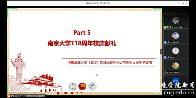 活动第五项,中国地质大学(武汉)为南京大学118周年校庆献礼,生物大气党支部全体成员打开摄像头,向他们表示了最真诚的祝愿:中国地质大学(武汉)beat365中文官网生物大气专业大学生党支部全体祝南京大学118周年校庆生日快乐,繁荣昌盛,再谱华章。生物大气党支部党员王立诚说:值此南京大学成立118周年之际,祝福南京大学生日快乐。大江之东,金城之中,天开教泽,道启南雍。自1902年以来,回望历史,南京大学总是宏大而光辉的,嚼得菜根做的大事为这所大学奠定了百年基调。去年十一月也有幸去南京大学鼓楼校区游玩,绿茵蓝天的衬托下,北大楼的身姿愈发青葱,布满爬山虎的藤蔓有种淡雅祥和的气息,和“中国最温和的大学”之称莫名契合。忠于使命,勇于担当,如日之升,如月之恒,最后,祝愿南京大学再创辉煌!