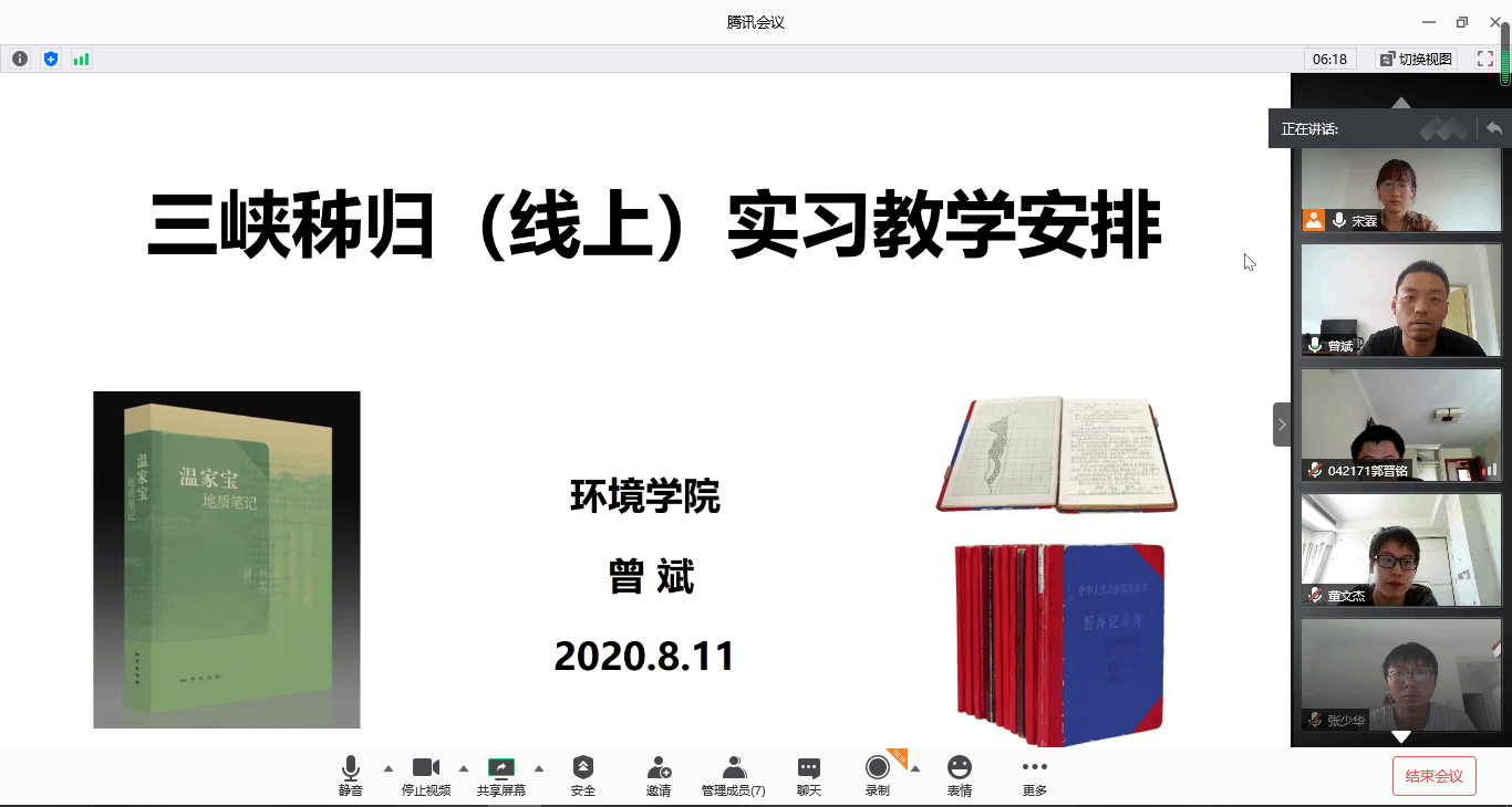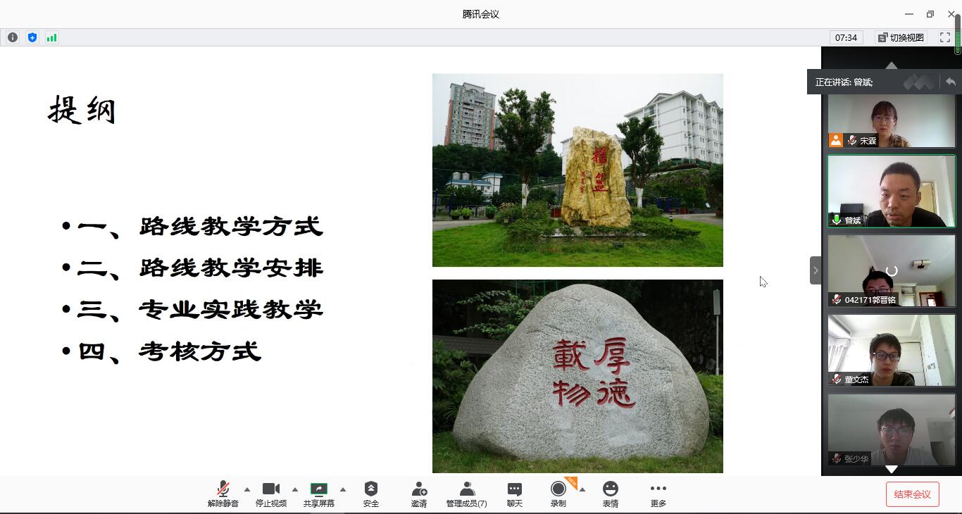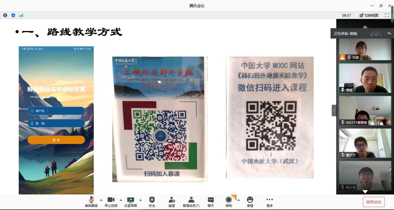 本次线上实习任务讲解分为路线教学实习、路线教学安排、专业实践教学、考核方式四部分,由实习队队长曾斌进行讲解。为保证本次线上教学质量,丰富学习内容,同学们分别要在MOOC三峡地质野外实践完成实习区区域地质认识、在MOOC秭归野外地质实践教学复习回顾野簿记录,地层剖面图绘制及地质填图等工作的方法、在beat365中文官网研发制作的秭归野外实习虚拟仿真软件完成教学路线的学习。同时,还要在MOOC完成环境地质调查思维与实战课程的学习。最后结合在秭归野外实习虚拟仿真软件的测评成绩与实习报告的得分给出最终实习成绩。最后,曾斌强调了野外实践学习的重要性,并鼓励大家只要认真学习,在线上学习也能收获满满!