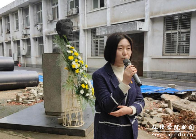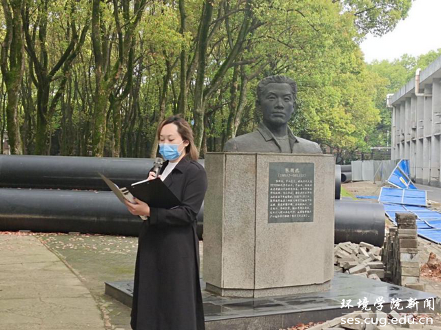 “张国旗班”团支部成员段翔讲述张国旗事迹。张国旗的一生,是找水的一生。在我校以优秀的成绩毕业后,他放弃了优越的工作机会,选择回到自己贫困的家乡—陵川县,投身于解决山区吃水难、找水难的问题,为保护他人奉献出自己年轻的生命。他说到“张国旗的一生虽然只有短短的33年,但他回乡找水的选择,毅然救人的壮举,将永远影响着我们一代一代的地大环境学子。”