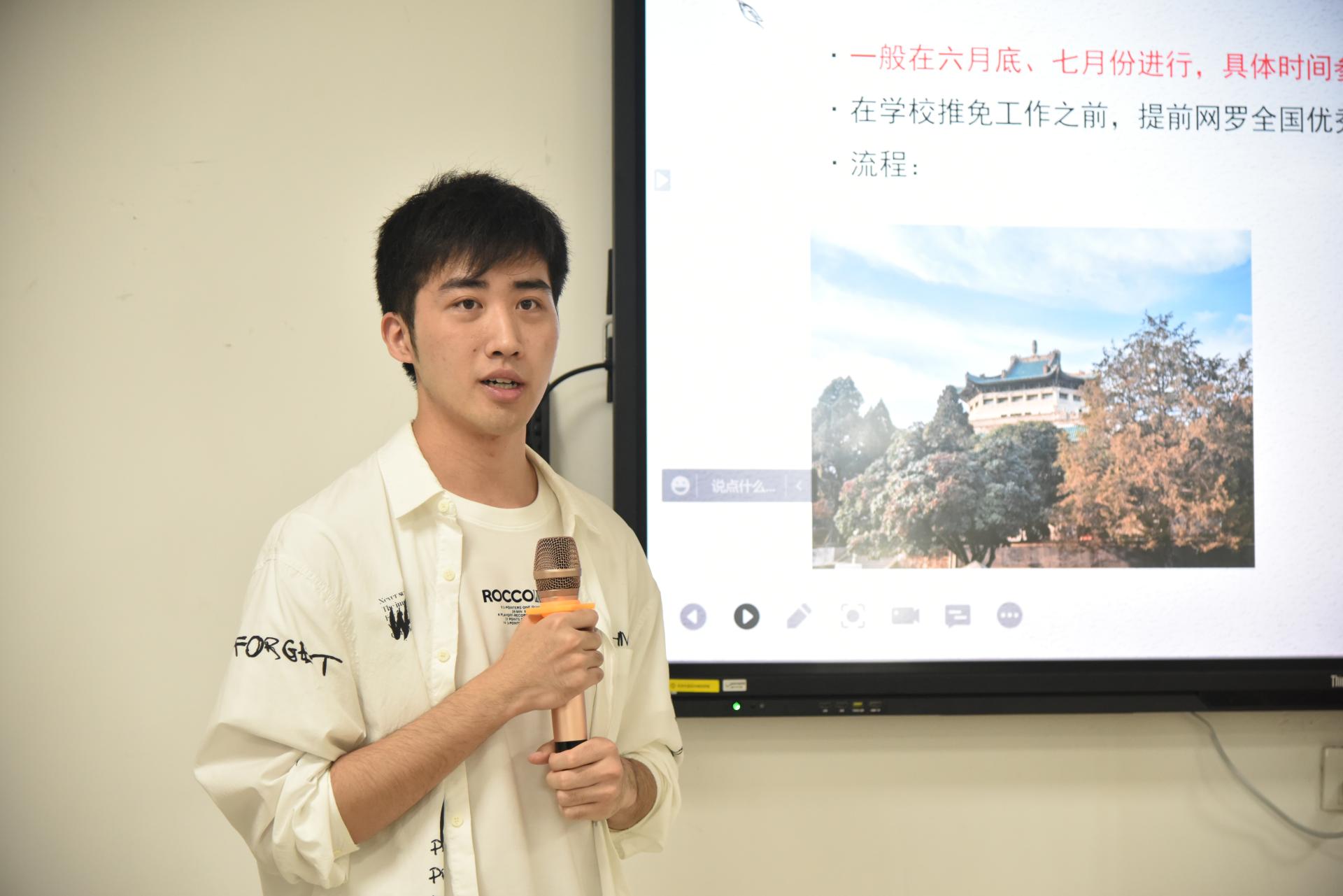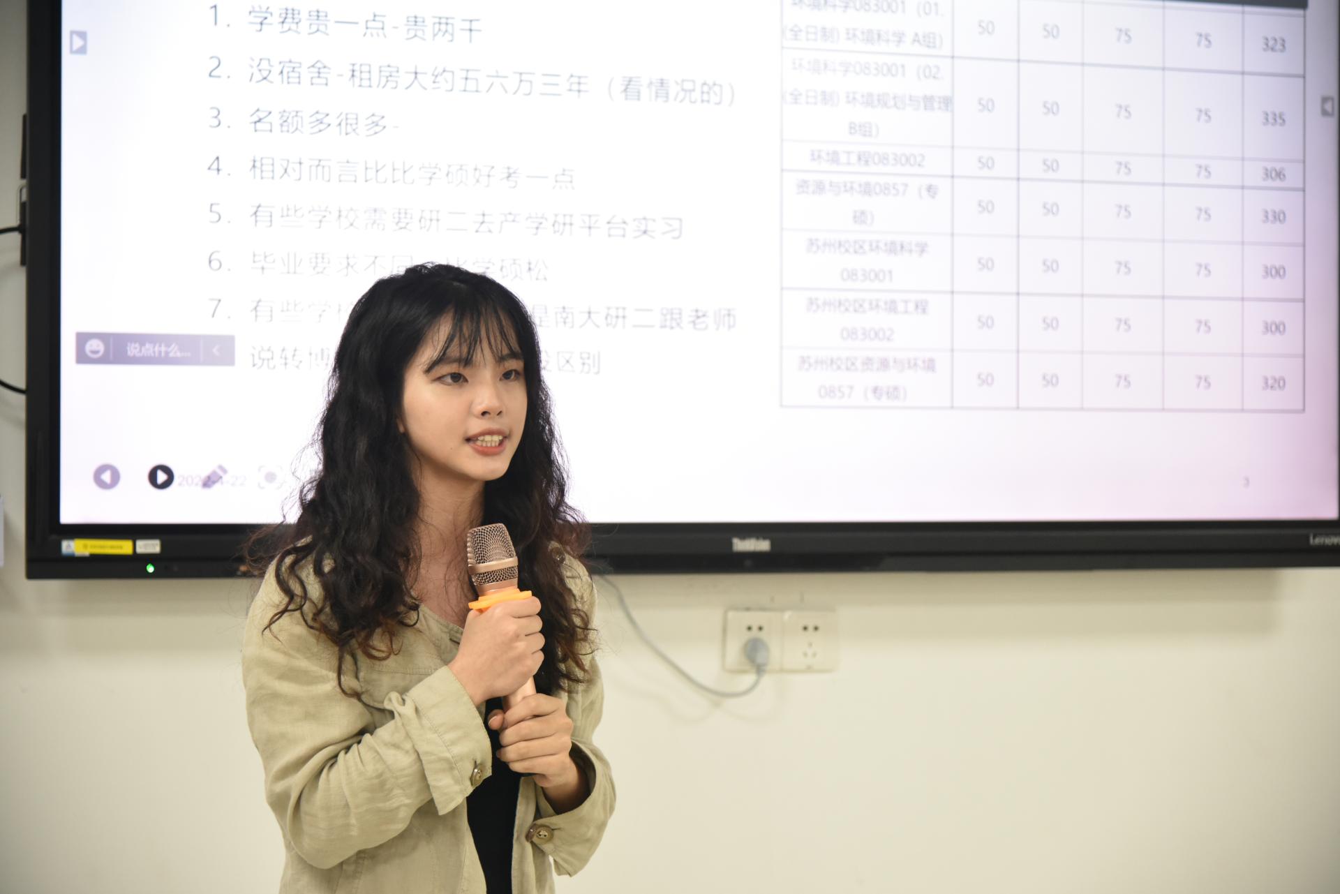 首先,2018级中加项目学生李宜伦以专业绩点排名第一的成绩获得保研推免至武汉大学水利水电学院,他从夏令营、预推免和正式推免三个阶段的流程,院校选择,联系导师,学院推免方案等方面进行了详尽的讲解,鼓励同学们尽早确定方向,找准自己的专业目标,努力提升自身水平和综合素质;贺沁文通过我校“本硕博”贯通培养计划获得保研推免资格,将攻读beat365官网环境科学与工程专业(直博),他就计划介绍、参选条件、录取流程、前期流程等方面对该计划进行介绍,建议同学们慎重抉择,提前做好规划,尽早与导师取得联系,在保研之路上放平心态、张弛有度。