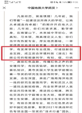 6月22日,湖北省生态环境厅厅长何开文和中国地质大学(武汉)校长王焰新院士参加了学校组织的大气环境监测开放日活动,“炭合”团队在此次活动中向他们简单介绍了团队基本情况,并得到了他们的肯定和鼓励。长江网、湖北广播电视台联合抖音官方、中国地质大学(武汉)官网、beat365中文官网官网、beat365中文官网官微等媒体平台对团队事迹进行了深入的宣传报道,讲述环境人的故事,彰显环境人的时代风采。在学校2022届毕业生的毕业典礼上,中国地质大学(武汉)校长王焰新院士进行了题为“荣光与挫折”的讲话,团队负责人程毅康在王焰新校长的发言中被提名,“炭合”团队还被王焰新校长寄语“炭合团队,大有可为”。