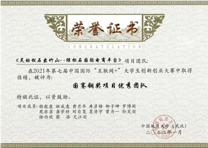 “炭合”团队成立一年多来,成效显著、硕果累累。在“互联网+”、“挑战杯”、创青春等多项赛事中,团队奋勇争先,先后获得国家级荣誉4项。分别为2021年第七届中国国际“互联网+”大学生创新创业大赛国际赛道国家级铜奖、传统赛道国家级铜奖,2021年第八届“创青春”中国青年创新创业大赛(乡村振兴专项)国家级优秀奖,获得多项省级荣誉。同时团队还获得“中央高校基础科研资助资金”等多项国家级和省部级大创项目,在学校科报会、“挑战杯”比赛和信调大赛等多项竞赛中荣获佳绩,也获得宇驰创新创业奖学金。团队内多名成员荣获国家奖学金、校长奖学金、院士奖学金等荣誉,多位成员获得学校推免资格。