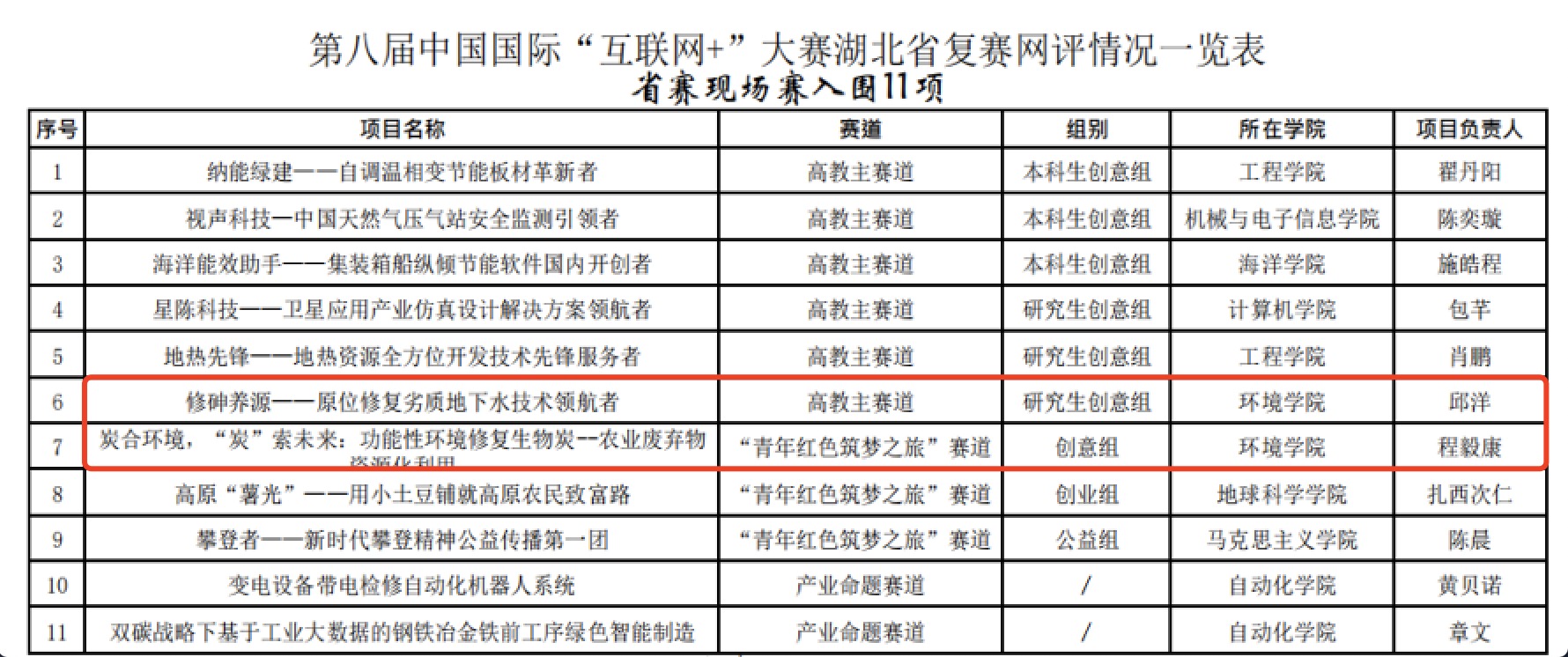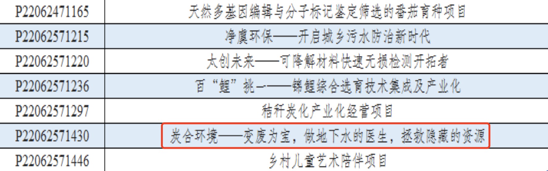 目前团队正在全力备战“互联网+”、“创青春”等赛事,团队多个项目已成功入围现场赛决赛。其中“‘炭合’环境,‘炭’索未来:功能性环境修复生物炭——农业废弃物资源化利用”和“修砷养源——原位修复劣质地下水技术领航者”2个项目已进入2022年第八届中国国际“互联网+”大学生创新创业大赛省赛现场赛;“炭合环境——变废为宝,做地下水的医生,拯救隐藏资源”进入2022年第九届“创青春”中国青年创新创业大赛全国半决赛;由“炭合”团队与“积水”团队合作申报的4项作品《Sab仿生结构的多能耦合空气集水灌溉装置》、《基于一维水平流且附带线上计算功能的多段式农田土壤包气带水动力弥散系数测定仪》、《农用灌溉地下水净化滤芯》、《太阳能聚热的生物炭制备返田装置》也已入围2022年第三届华维杯全国大学生农业水利工程及相关专业创新设计大赛一等奖决赛。