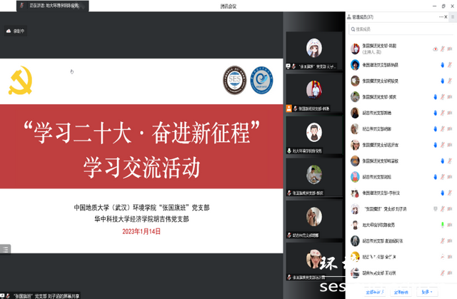 2023年1月14日,“张国旗班”党支部联合华中科技大学经济学院胡吉伟党支部在线上开展“学习二十大·奋进新征程”学习交流活动。支部书记韩鹏解读了党的二十大主题、报告结构,梳理了重要提法、最新论断,以青年党员身份分享了学习党的二十大报告的体会。胡吉伟党支部书记王艺晓带领大家回顾了《中国共产党章程》的诞生和历次修改的重要意义,系统讲解了党的二十大对党章的修改内容。两个以英雄榜样人物名字命名的党支部,共同学习贯彻党的二十大精神、传承红色基因铸魂育人,筑强支部战斗堡垒。