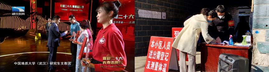时任湖北省副省长宁咏为宣讲人韩鹏颁奖(左)、疫情期间韩鹏在社区卡点担任防疫志愿者(右)