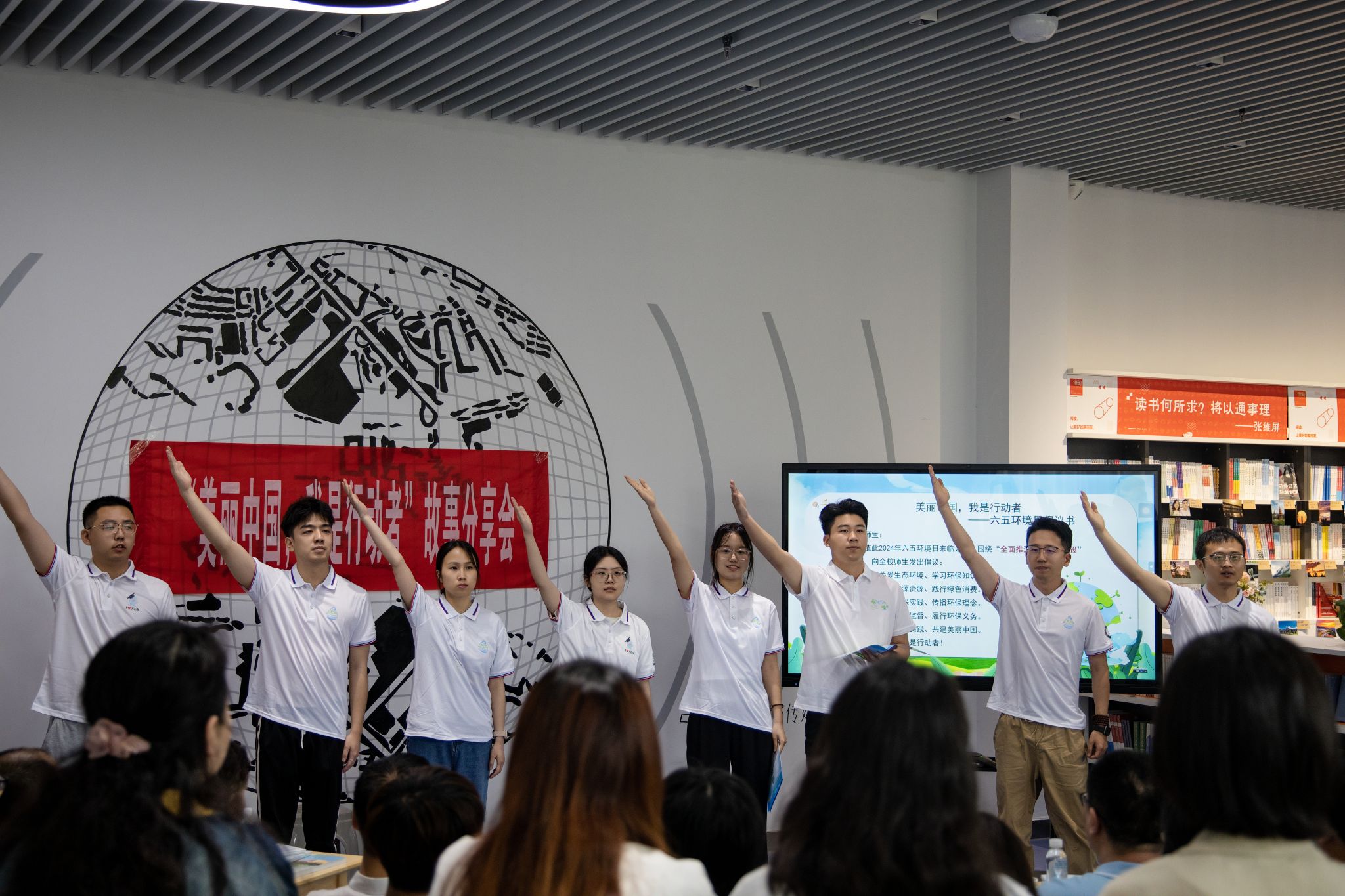 学生代表向全校师生发出世界环境日倡议,号召大家一起行动、共同努力,关爱生态环境、学习环保知识;节约能源资源、践行绿色消费;参加环保实践、传播环保理念;开展环境监督、履行环保义务;投身伟大实践、共建美丽中国。