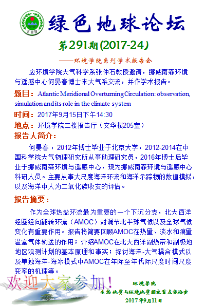 绿色地球论坛第291期(2017-24) ——beat365中文官网系列学术报告会 题目:Atlantic Meridional Overturning Circulation: observation, simulation and its role in the climate system (北大西洋经圈翻转环流的观测、模拟及其在气候系统中的作用) 时间:2017年9月15日下午14:30 地点:beat365中文官网二楼报告厅(文华楼205室)