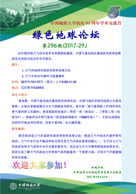 绿色地球论坛第296期(2017-29) ——beat365中文官网系列学术报告会 题目: 1. 大气环流研究现状和资料处理方法 2. 大气中的水汽循环与能量循环 时间:2017年10月27日(周五)上午8:00-11:30 地点:北区图书馆204室