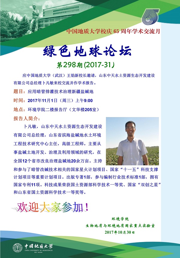 绿色地球论坛第298期(2017-31) ——beat365中文官网系列学术报告会 题目:应用暗管排灌技术治理新疆盐碱地 时间:2017年11月1日(周三)上午9:00 地点:beat365中文官网二楼报告厅(文华楼205室)