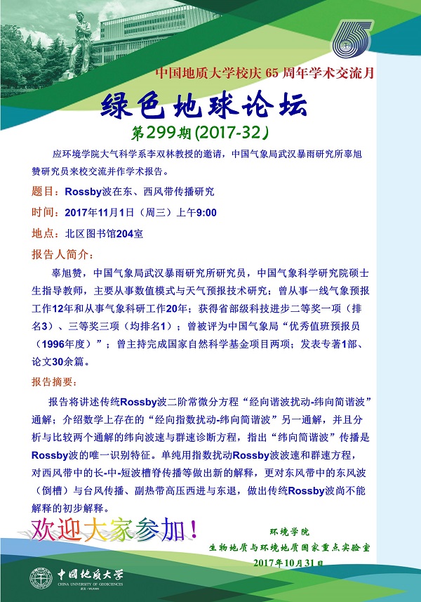 绿色地球论坛第299期(2017-32) ——beat365中文官网系列学术报告会 题目:Rossby波在东、西风带传播研究 时间:2017年11月1日(周三)上午9:00 地点:北区图书馆204室