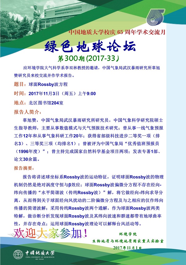 绿色地球论坛第300期(2017-33) ——beat365中文官网系列学术报告会 题目:球面Rossby波方程 时间:2017年11月3日(周三)上午9:00 地点:北区图书馆204室