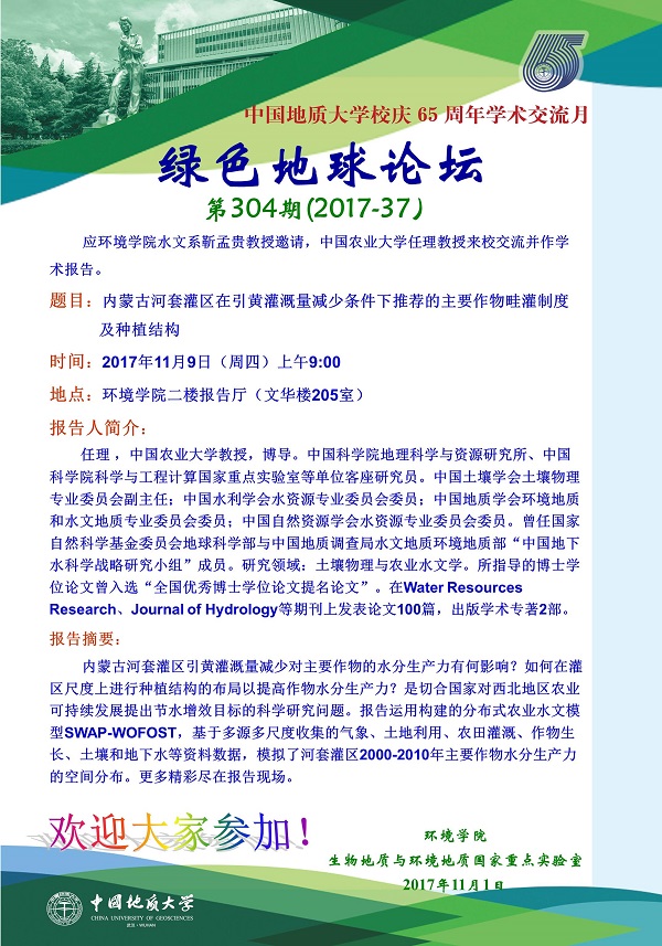 绿色地球论坛第304期(2017-37) ——beat365中文官网系列学术报告会 题目:内蒙古河套灌区在引黄灌溉量减少条件下推荐的主要作物畦灌制度及种植结构 时间:2017年11月9日(周四)上午9:00 地点:beat365中文官网二楼报告厅(文华楼205室)