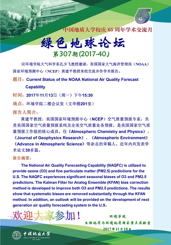 绿色地球论坛第307期(2017-40) ——beat365中文官网系列学术报告会 题目:Current Status of the NOAA National Air Quality Forecast Capability 时间:2017年11月13日(周一)下午15:30 地点:beat365中文官网二楼会议室(文华楼201室)
