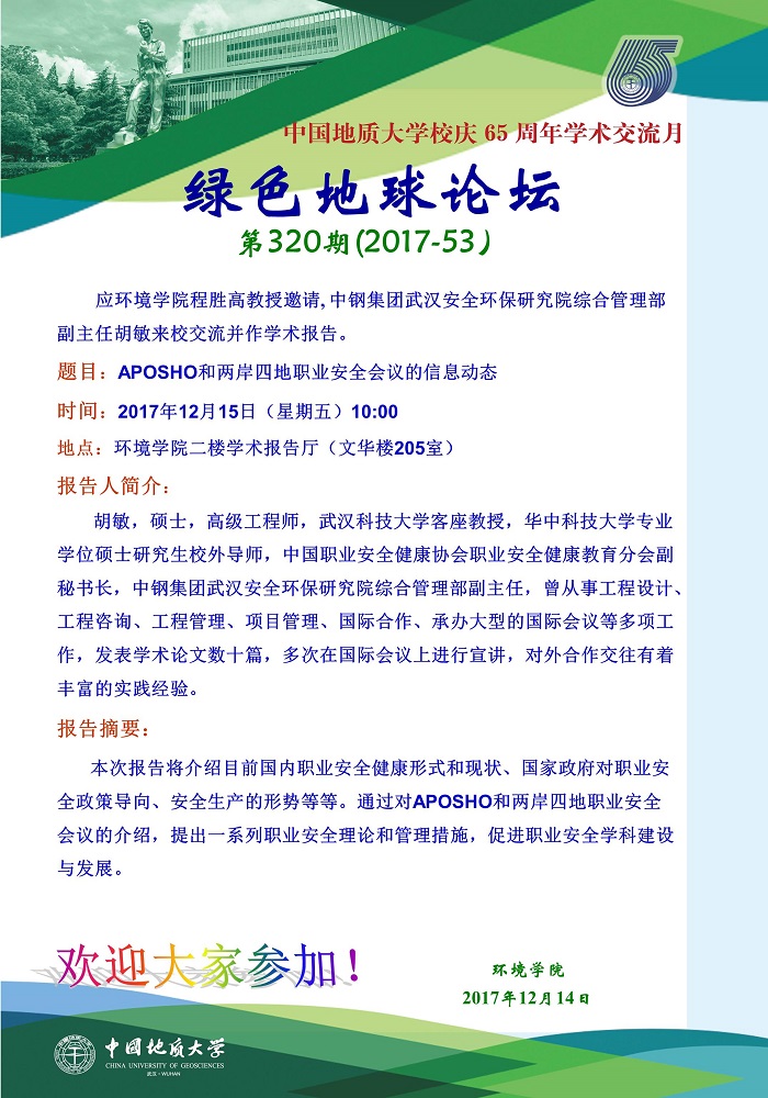 绿色地球论坛第320期(2017-53) beat365中文官网“校庆65周年学术交流月”——高知论坛 题目:APOSHO和两岸四地职业安全会议的信息动态 时间:2017年12月15日(周五)上午10:00 地点:beat365中文官网二楼学术报告厅(文华楼205室)