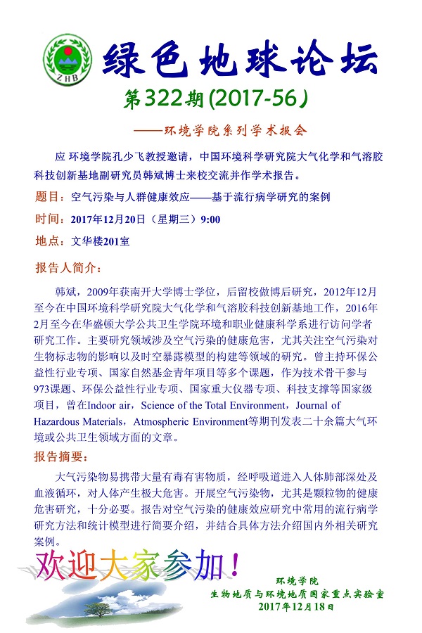绿色地球论坛第322期(2017-56)——beat365中文官网系列学术报告会 题目:空气污染与人群健康效应——基于流行病学研究的案例 时间:2017年12月20日(星期三) 上午9:00 地点:文华楼201室