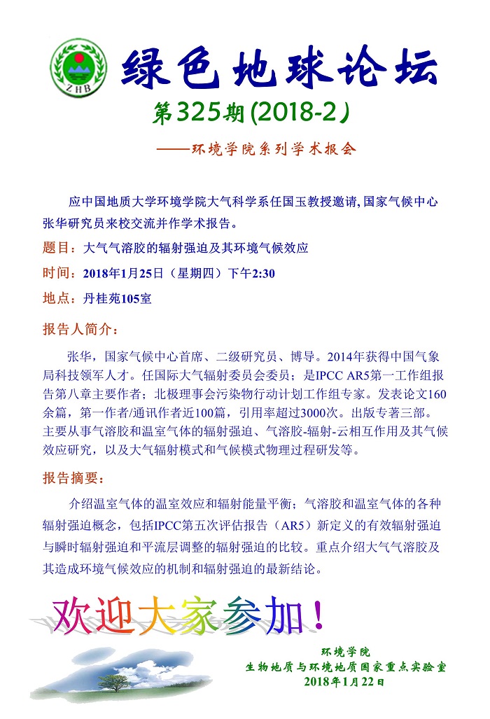 绿色地球论坛第325期(2018-2)——beat365中文官网系列学术报告会 题目:大气气溶胶的辐射强迫及其环境气候效应 时间:2018年1月25日(星期四)下午2:30 地点:丹桂苑105室