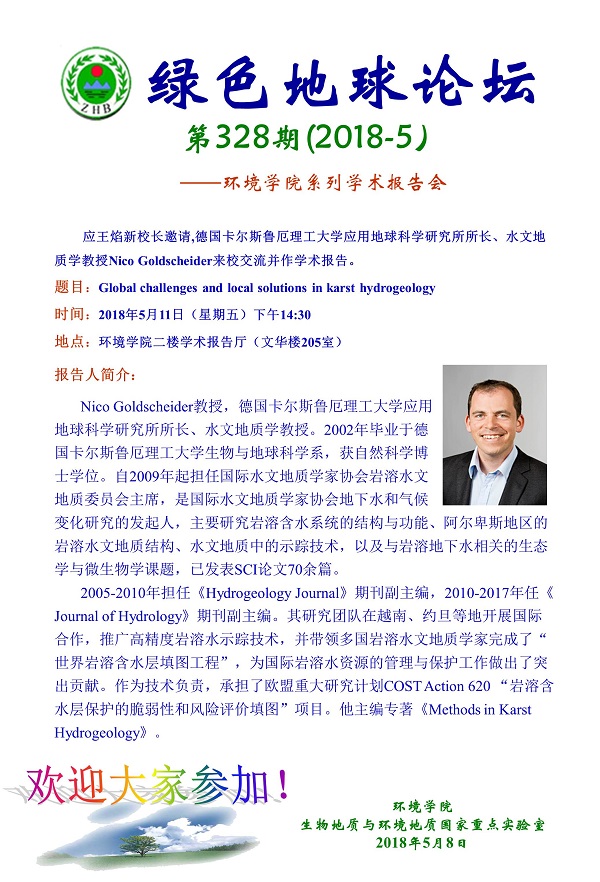 绿色地球论坛第328期(2018-5) ——beat365中文官网系列学术报告会 题目:Global challenges and local solutions in karst hydrogeology 时间:2018年5月11日(周五)下午14:30 地点:beat365中文官网二楼学术报告厅(文华楼205室)
