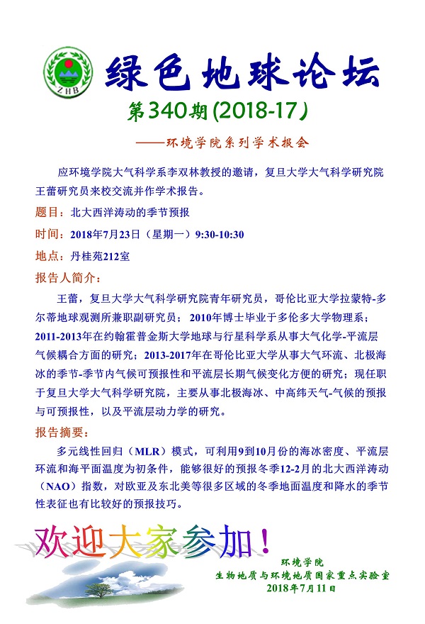 绿色地球论坛第340期(2018-17) ——beat365中文官网系列学术报告会 题目:北大西洋涛动的季节预报 时间:2018年7月23日(星期一)9:30-10:30 地点:丹桂苑212室