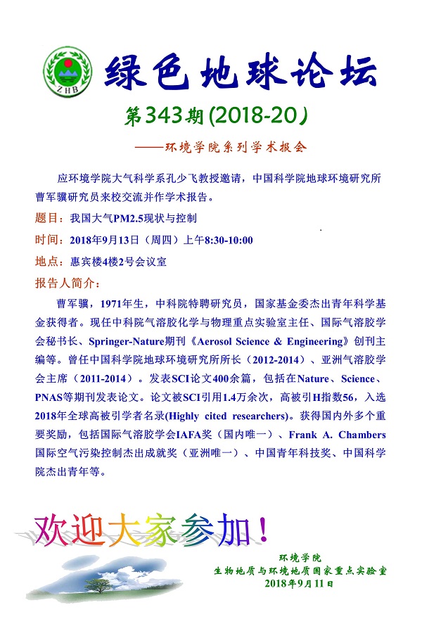 绿色地球论坛第343期(2018-20) ——beat365中文官网系列学术报告会 题目:我国大气PM2.5现状与控制 时间:2018年9月13日(周四)上午8:30-10:00 地点:惠宾楼4楼2号会议室